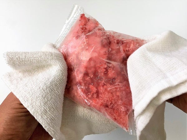 氷をもみほぐします。溶けないように素手で触らず、手早く。