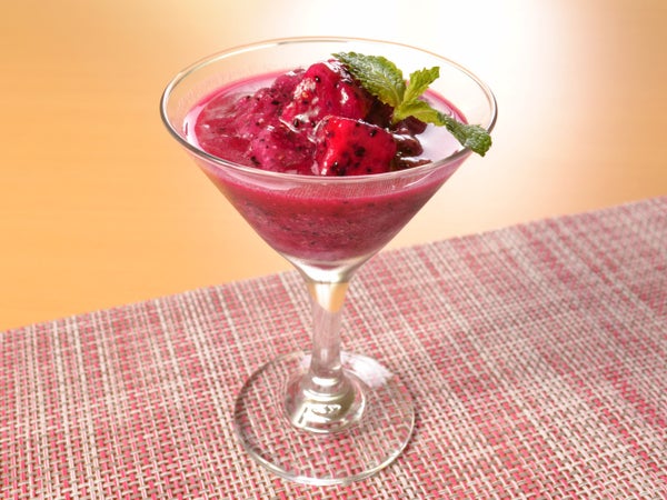 その見た目の色から強い味を想像してしまいますが、実際の味はとても淡白です。さっぱりとした淡い甘みがあり、酸味はほとんどありません。果肉はやわらかく、さくさくトロトロした口当たり。点々と散らばっている細かい黒い種子は、キウイの種に似ています。やさしい(というか薄い)味なので、スイーツやドリンクに使用する際は味を加えたほうがいいでしょう。逆に言えば、味の個性は弱いのでなんにでも合うので、さまざまなメニューに赤い色を活かすことができます。