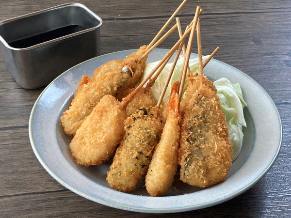 海鮮を中心とした串揚げ5種類(いか磯部・あじ・えび・いわし梅しそ・れんこん海鮮すり身)が2本ずつ入っているお手頃サイズのセットです。
