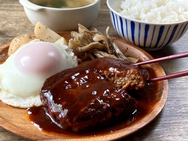 ハンバーグは、鉄板で焼いた中にも「箸でほぐれるやわらかさ」と「あふれる肉汁」を再現した「ハンバーグヴィアンド」。ソースは、赤ワインをベースにコクと旨みを出したデミグラスソース。レンジ調理で提供できるソース入り個食パックが便利です。