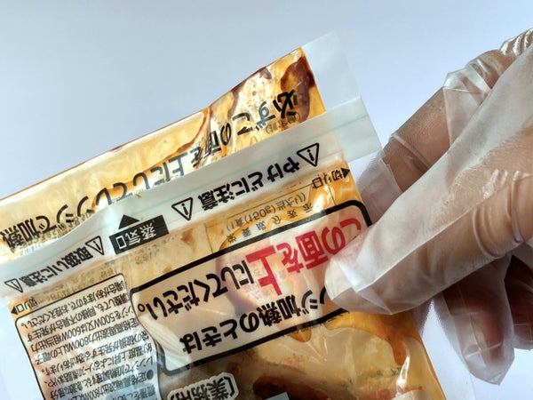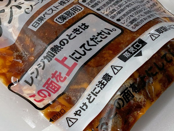 レンジ後は写真の向きで扱ってください。蒸気孔が開いていてソースが出る可能性があります。