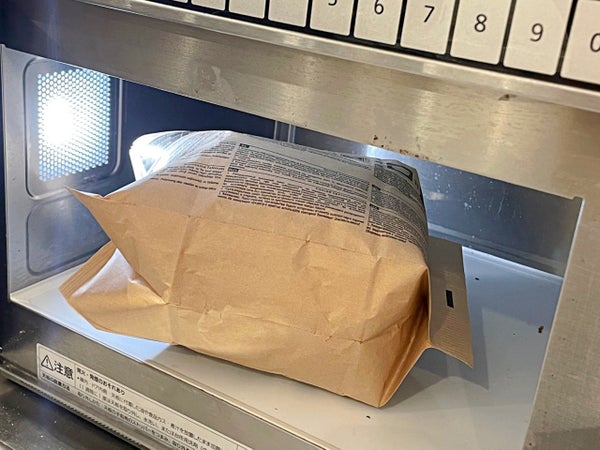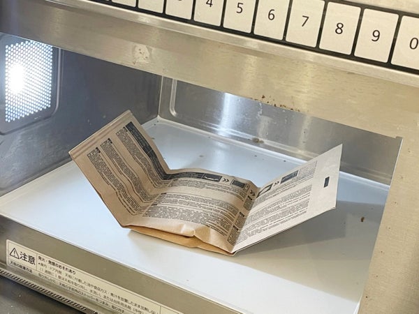 中の紙包装を広げてレンジ加熱します。(500Wで約3分)