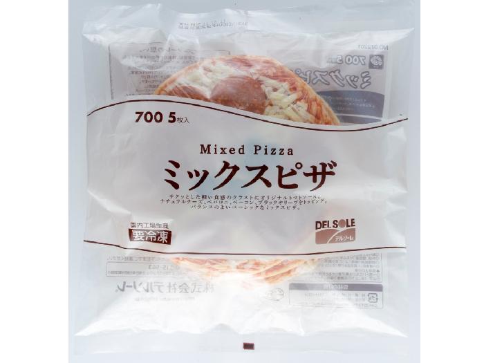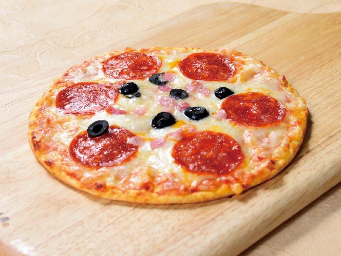 ピザクラスト(小麦粉、植物油脂、砂糖、イースト、食塩、麦芽製剤)、ナチュラルチーズ、トマトソース、ペパロニソーセージ、ベーコン、ブラックオリーブ/乳化剤、酸味料、カゼインNa、リン酸塩(Na)、増粘剤(キサンタンガム)、着色料(パプリカ色素、コチニール)、調味料(アミノ酸)、酸化防止剤(ビタミンC)、発色剤(亜硝酸Na)、香辛料抽出物、グルコン酸第一鉄、(一部に小麦・乳成分・大豆・豚肉を含む)