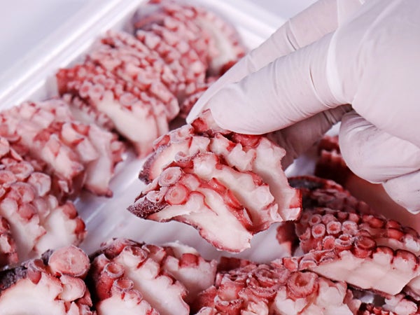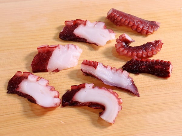 ゆでたこの足をスライスしています。3~5gの小さめ、足先も含みます。