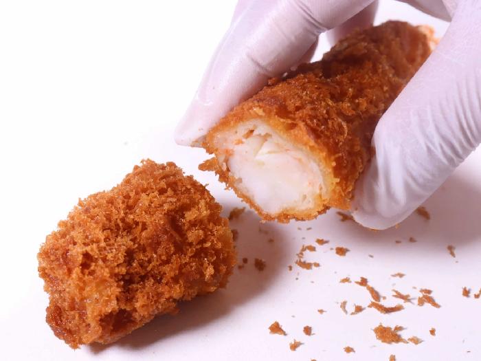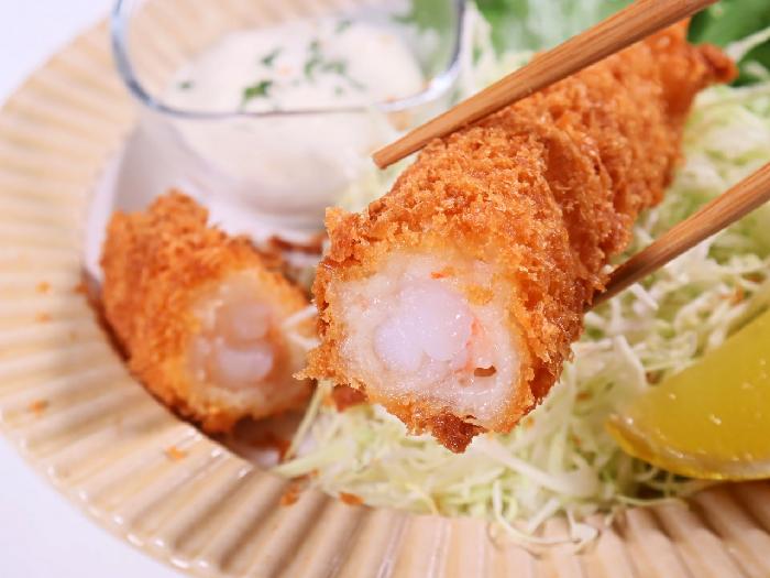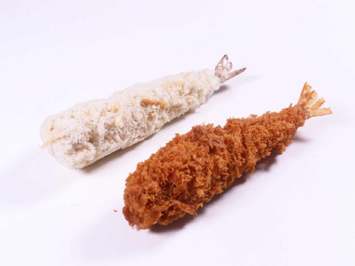 実は2尾のえびを使用しているのです。筋切りしたフライ用の伸ばしえびに、さらに開きえびを巻き付けています。