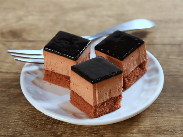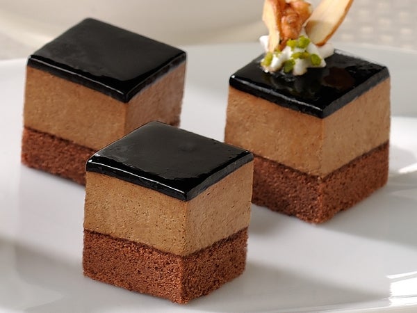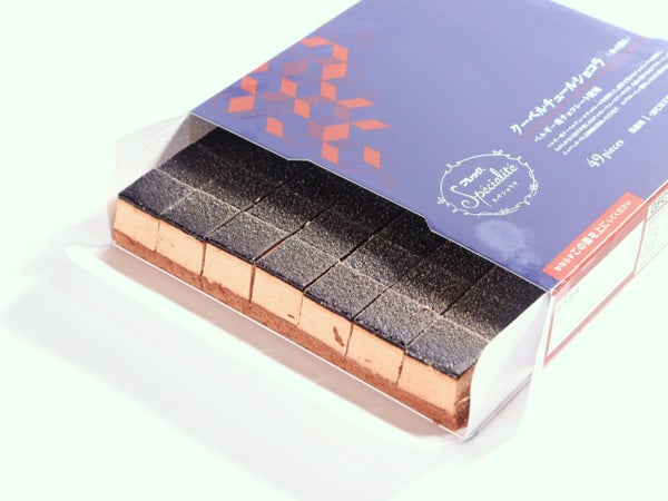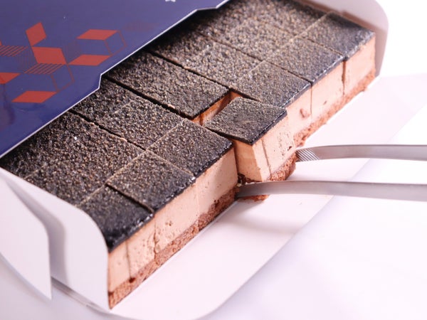 ベルギー産クーベルチュールチョコレートを使用した口溶けなめらかなケーキを、約2.5cm角にカットしました。