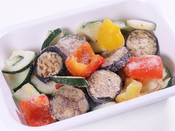 ズッキーニ・なす・赤パプリカ・黄パプリカの4種ミックス。大きめのカットが特徴です。