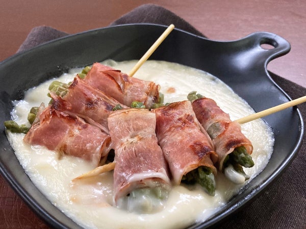 「アスパラベーコン串のチーズグラタン」