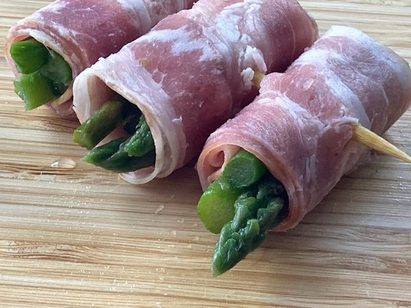 細アスパラ数本を、薄切りベーコンで束ねて3周ほど巻き上げています。
