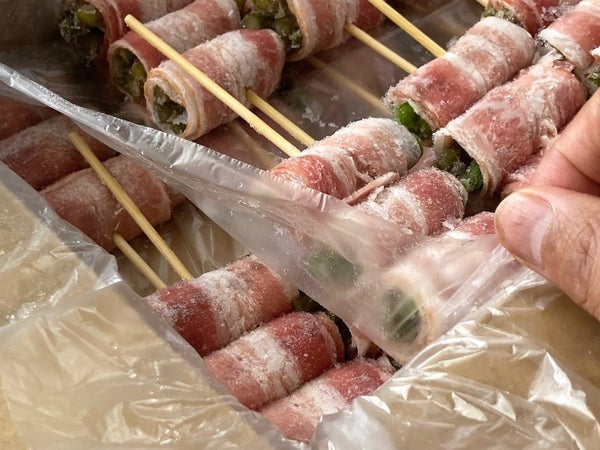 串が通っていないアスパラもあるので串が回りやすいです。アスパラが抜け落ちないように焼いてください。