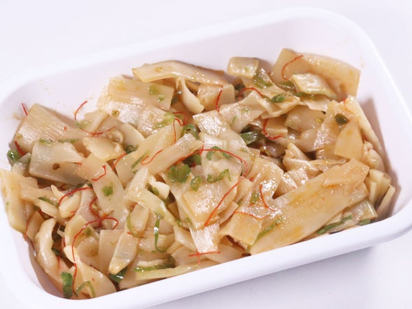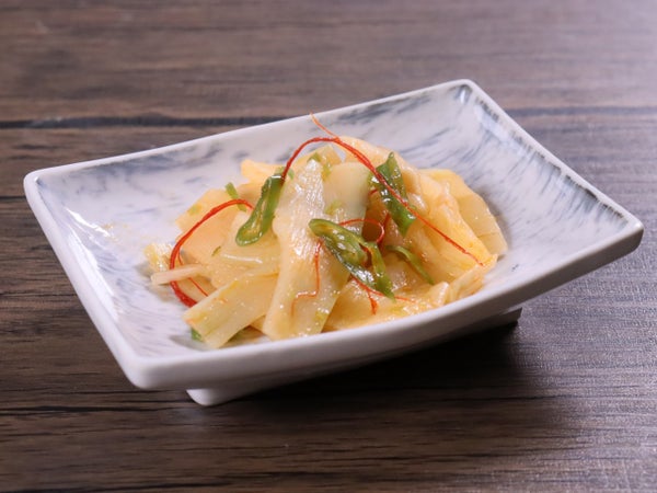 薄切り短冊状のたけのこに、青唐辛子の刻みと糸唐辛子の彩り。