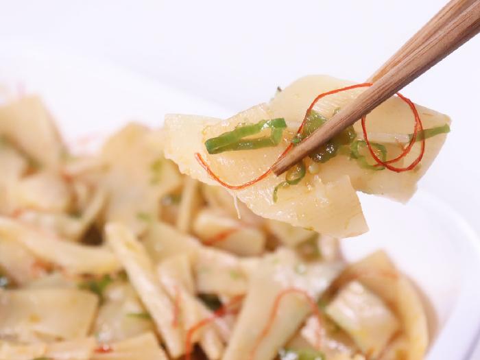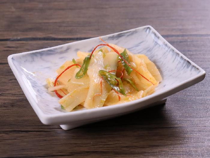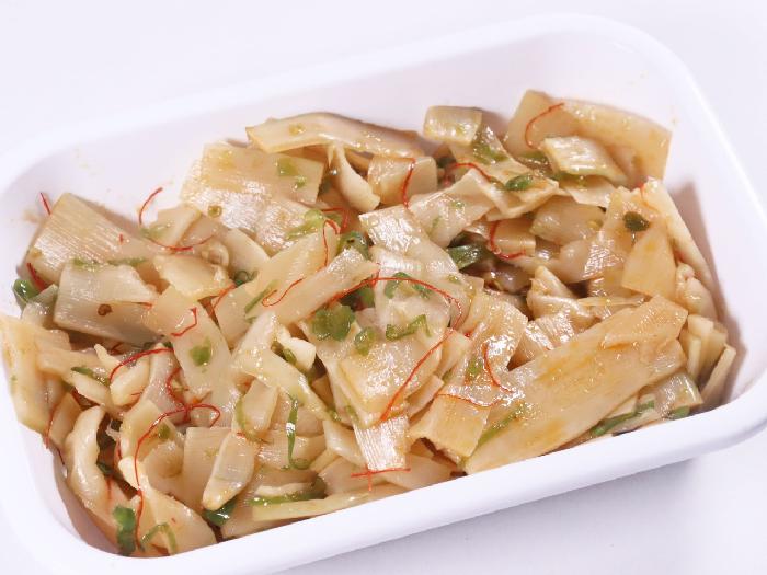 たけのこ(中国)、青唐辛子(中国)、砂糖、ごま油、醤油、食塩、中華調味料、ポークエキス、唐辛子、風味調味料/ソルビット、調味料(アミノ酸等)、酸味料、酸化防止剤(V.C)、(一部に小麦・ごま・大豆・鶏肉・豚肉を含む)