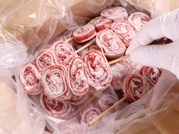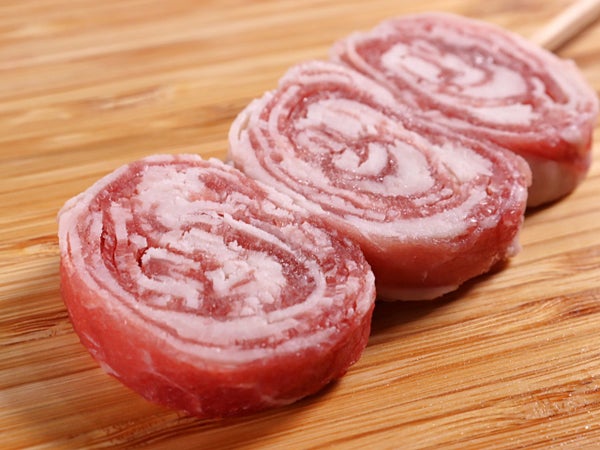 アメリカ産牛バラスライスをグルグルとロール状にして串に刺しました。食べやすく、柔らかい食感が特長です。