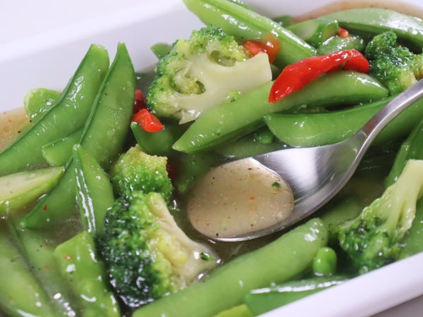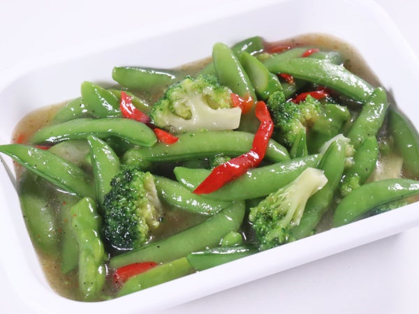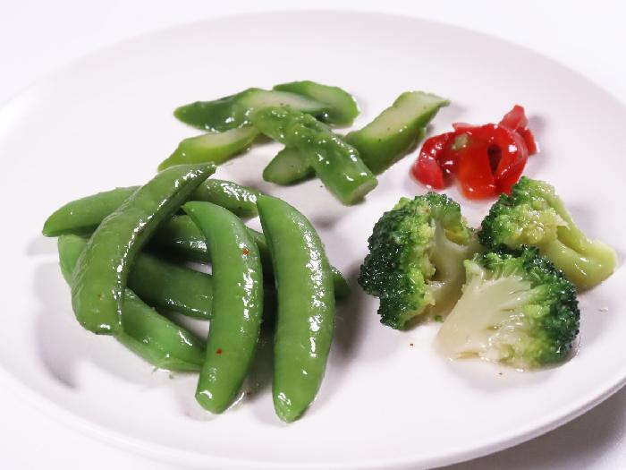 スナップエンドウ、ブロッコリー、アスパラガス、食用植物油脂、赤ピーマン、食塩、砂糖、にんにくペースト、チキンエキス調味料、香辛料/トレハロース、pH調整剤、調味料(アミノ酸)、グリシン、増粘剤(キサンタンガム)、酸化防止剤(V.C、フェルラ酸)、(一部に小麦・大豆・鶏肉を含む)