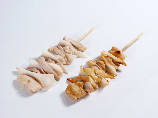 ヤゲン(むね軟骨)のコリコリした独特の歯ごたえを楽しめる軟骨串です。ヤゲンの間の肉には鶏もも肉を使用しています。原料はいずれもタイ産鶏肉、タイで製造されたものを輸入しています。
