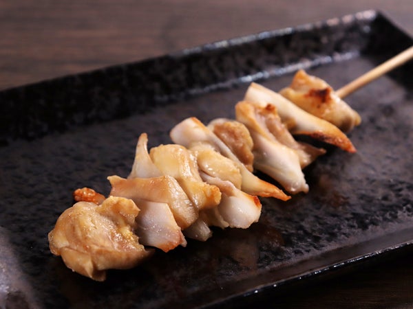 6個のヤゲンと7個の鶏もも肉を交互に打っていて、先端と手元が鶏もも肉です。長めの18cm串。