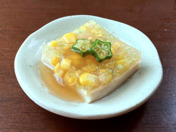 とうもろこしの甘みを閉じこめた、季節感のある胡麻豆腐です。そのままでもおいしいですが、銀あんを添えて彩りにオクラを添えてみました。