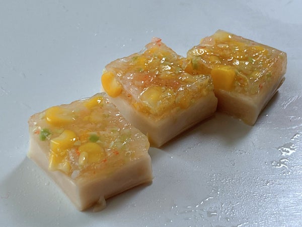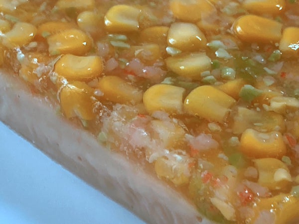 とうもろこし(黄色)、枝豆(緑色)、海老(赤色)をちりばめて彩りよく上側に流し、下の部分にはきめの細かい胡麻のペーストを流し2層に仕上げました。
