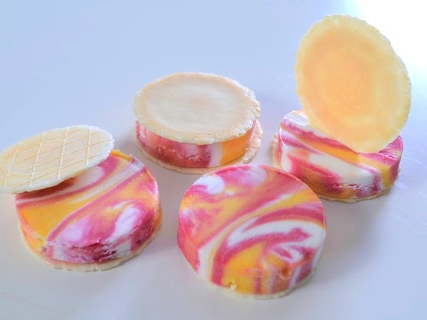 アイスはすくうもの、丸く球にするもの。それがあたりまえの盛り付けですが、テリーヌのようにスライスしてみたらマーブルアイスの魅力を最大限にアピールする断面が出てきました! お皿で食べるアイス、挟んで楽しむアイスなど、ちょっと見方を変えれば楽しみ方が広がるかもしれません。