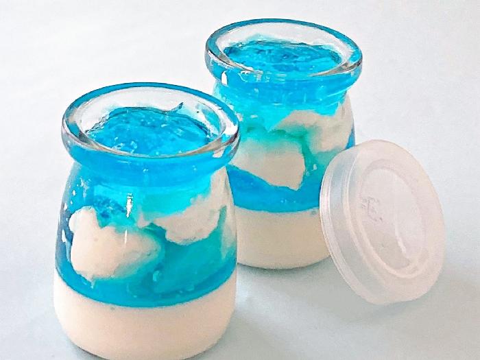 パイナップル果汁を使用し、ブルーハワイをイメージしたカラフルなクラッシュジュレ。フォトジェニックなキラキラスイーツや飲むゼリー入りドリンクに。