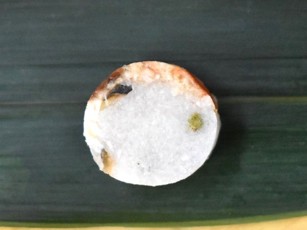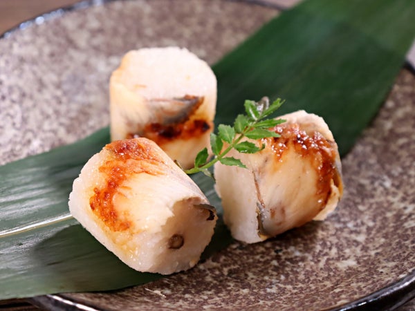 道明寺粉(砕いたもち米)で作ったほのかに甘いおもちが中心。中には山椒の粒が混ぜ込んであり、うなぎの蒲焼の薄切りで巻いてあります。