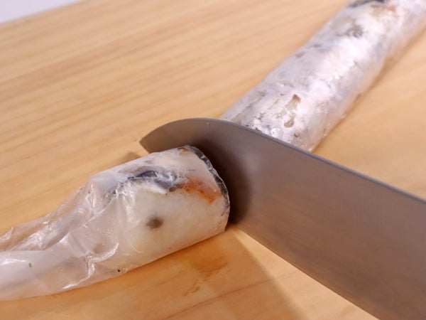 包装フィルムのまま切ると切りやすいです。フィルムを取り残さないようにご注意ください。