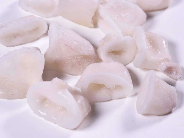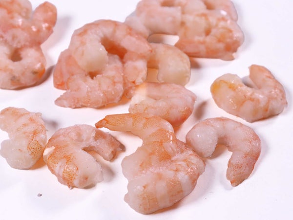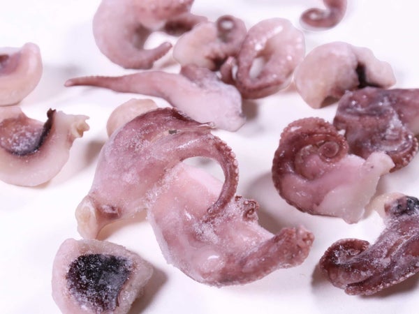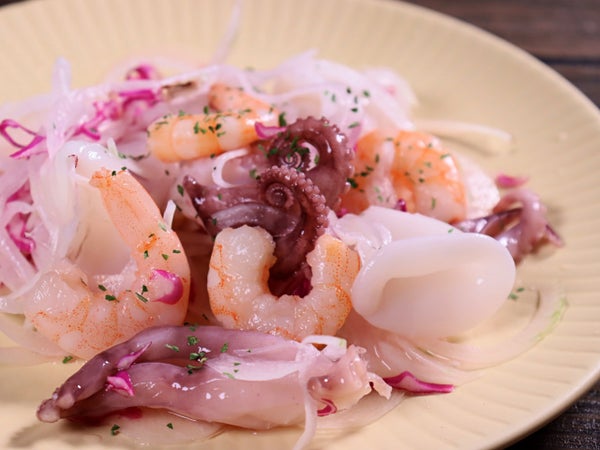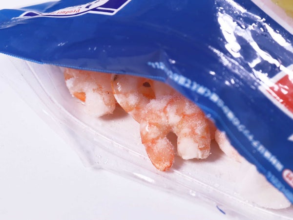 自然解凍で使えるので、シーフードマリネなど冷菜に便利です。グレーズ(品質保持のための氷膜)は薄めですが、解凍して水を切ってお使いください。