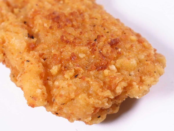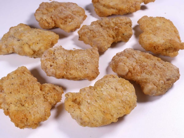 鶏肉(もも)、タピオカ澱粉、大豆蛋白、食塩、にんにく、香辛料、黒胡椒油、衣(パン粉、とうもろこし粉、香辛料、砂糖、食塩、小麦粉、粉末油脂(ヤシ油)、大豆蛋白)、揚げ油(大豆油)/増粘剤(加工澱粉)、調味料(アミノ酸)、ポリリン酸Na、ベーキングパウダー、着色料(ウコン)、(一部に小麦・大豆・鶏肉を含む)