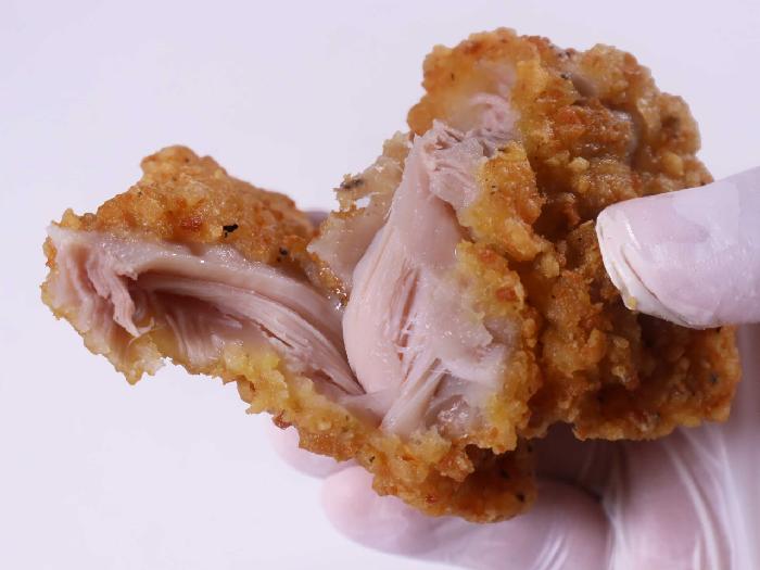 鶏肉(もも)、タピオカ澱粉、大豆蛋白、食塩、にんにく、香辛料、黒胡椒油、衣(パン粉、とうもろこし粉、香辛料、砂糖、食塩、小麦粉、粉末油脂(ヤシ油)、大豆蛋白)、揚げ油(大豆油)/増粘剤(加工澱粉)、調味料(アミノ酸)、ポリリン酸Na、ベーキングパウダー、着色料(ウコン)、(一部に小麦・大豆・鶏肉を含む)