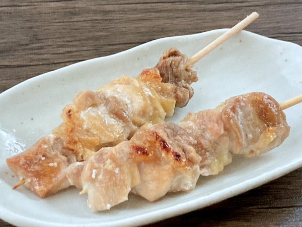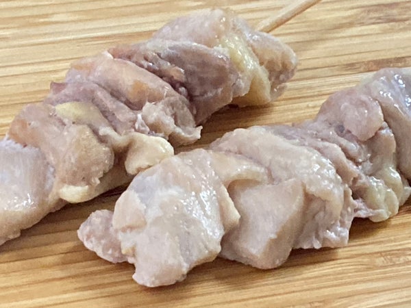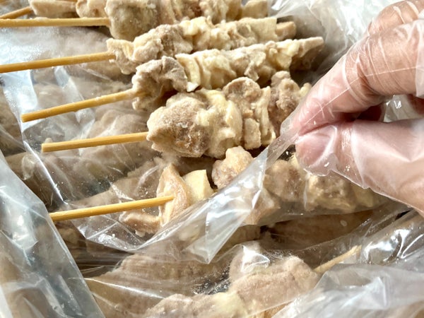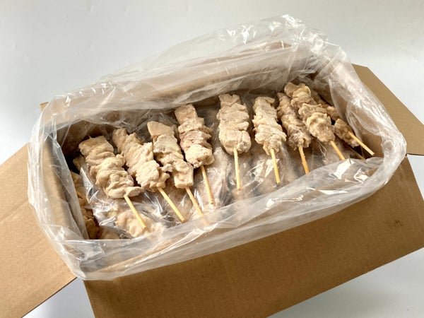 中国産の鶏もも肉に15cm丸串を打ってスチーム加工しました。現地工場で加工したものを輸入しています。柔らか加工はしておらずスチーム加熱のみなので、自然な鶏肉の食感です。そのぶん焼きすぎや焼いた後の放置をするとパサつきが生じるのでご配慮ください。