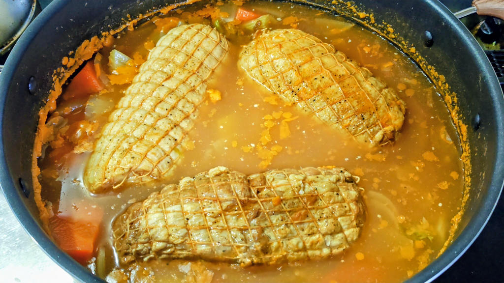 肩ロースとバラ肉の両方を注文してみて、同じようにリソレしてからミルポアとトマトペースト、ブイヨンでじっくり3時間以上煮込み、柔らかくなってからそのまま冷まし、翌日に取り出しカット、肩ロースのほうが脂身と肉のバランスが良いし、味も口溶けも良いと思います、 真空調理でないので65%位の上がりになりますが、味は染みて美味しい、 キュイソンにカットトマト缶を加え、ケチャップも入れてソースを仕上げ、肉をカットしソースと共にシーラーでパックにし湯煎で温めて提供する事に、