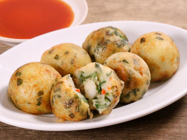 たこやきのように食べられる、ボール型のチヂミです。6個ずつ包装されていて、タレ付きだからとても便利!