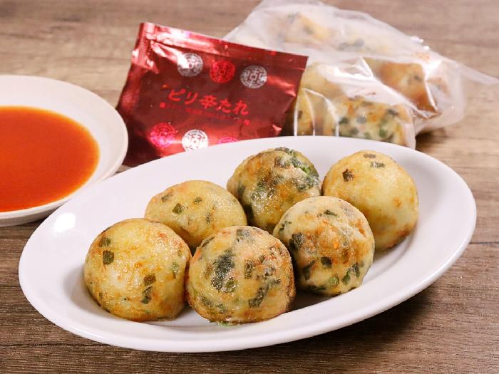 もちもちとした本格的なチヂミのおいしさをそのまま丸く焼き上げました。にらたっぷりで大粒約35g、6個ずつ小分けにして小袋のタレを付けました。