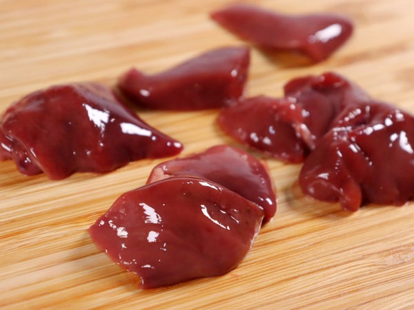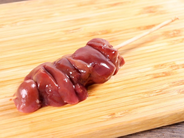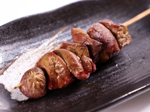 先端だけ小さいハツ(レバーの隣にある部位)を使って、串が抜けにくいように工夫しています。(それでもレバーはやわらかい部位なので抜け落ちにご注意ください)