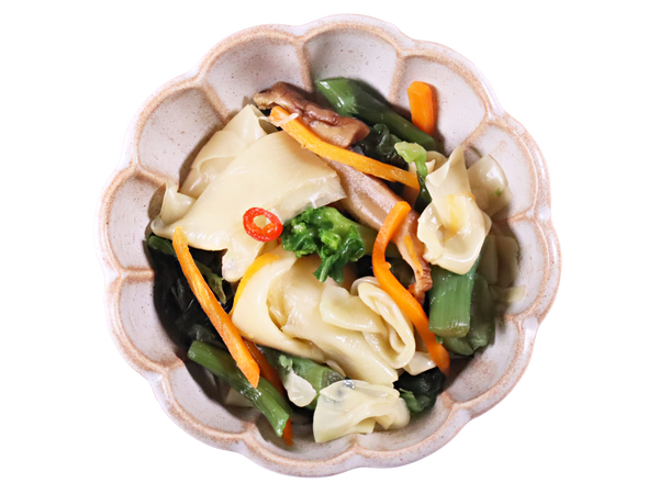 湯葉のような柔らかい筍の姫皮に菜の花・椎茸・人参を加えて、彩りと食感の良いおひたしに仕上げました。