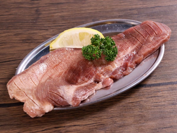 タン先からタン元まで(長さ約23cm)を約7mmスライスし、両面にスリットを入れたステーキ用牛タンです。下味程度に柔らか加工しています。