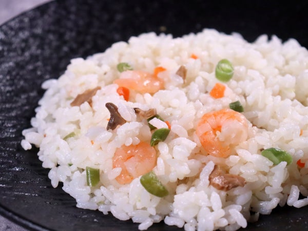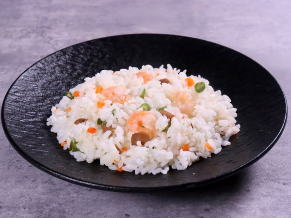 えびが映えるライスの白さを大切に、ニンジン、インゲン、ピーマンの彩りと風味をちりばめました。