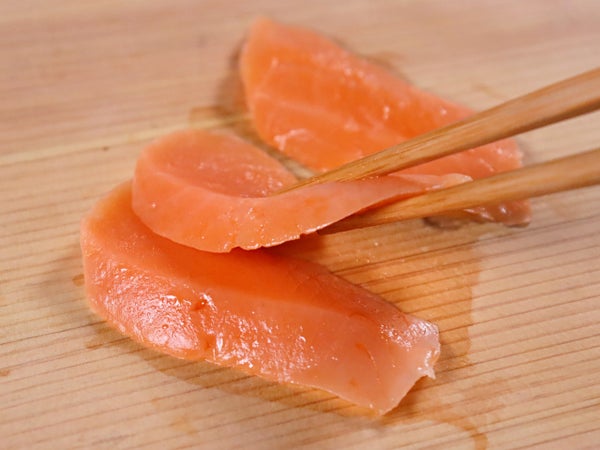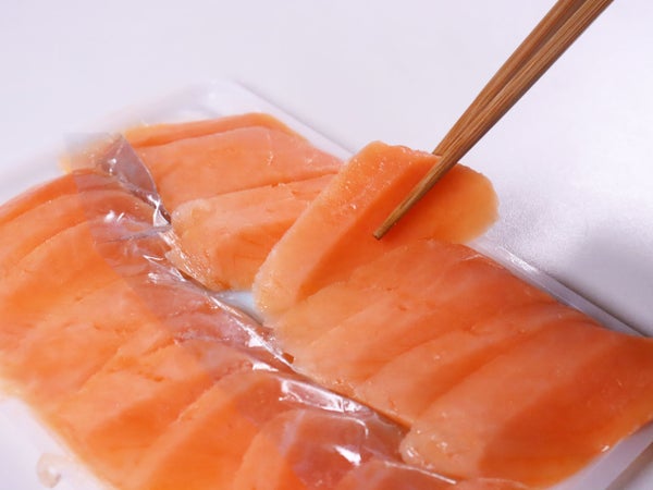 鮮度と色味が良い大型のトラウトサーモンを使用し、丁寧に骨をとりスライスしました。シート入りなので、使いやすいパックです。