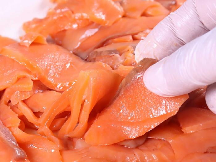 チリ産の銀鮭を国内工場でスモークし切り落としタイプにカットしました。形は不揃いですが、色々なメニューにご使用いただけます。