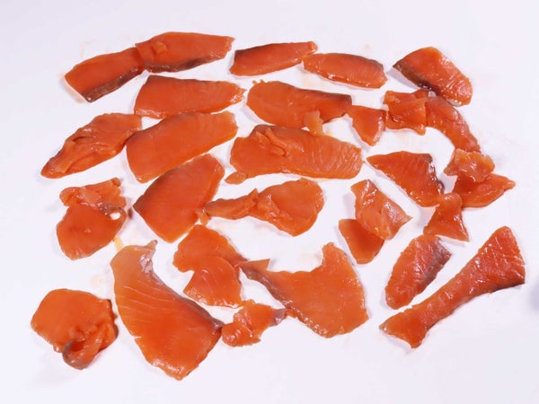 シルバーサーモン(銀鮭)のスモークの切り落としです。いろいろな切り落としが含まれます。かたまり状の端材は少なく、大小さまざまなスライスが中心です。