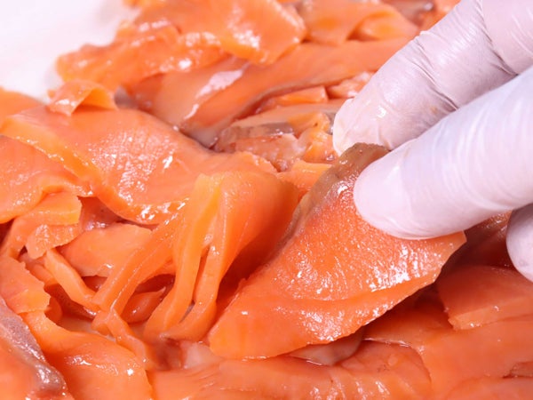ある程度剥がしてバラせる程度の塊になっています。ただし、シルバーサーモンの身はほぐれやすいので、スライス状のまま使いたい場合はやさしく剥がしてください。