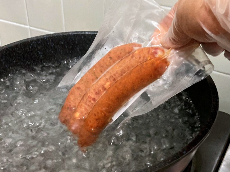 パックごと湯せんできます。その後フライパンで焼くといっそうおいしく仕上がります。