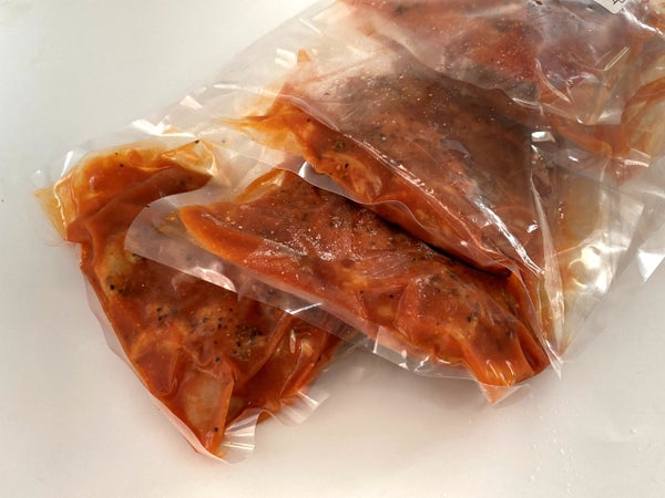 個食パックで湯せんするだけ!仕込みも食材も最低限で回せるチキンメニューです。鶏もも肉をオーブンで焼き上げ、先に凍結してからソースを充填してパックしています。だからチキン煮込みのような仕上がりにはなっていません。