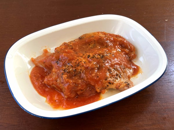 鶏モモ肉、トマトソース(発酵調味料・トマトケチャップ・ニンニク・トマトペースト・水あめ・その他)、しょうゆ、砂糖、発酵調味料、食塩、胡椒/リン酸塩(Na)、調味料(アミノ酸等)、増粘剤(加工デンプン・増粘多糖類)、着色料(紅麹・パプリカ色素)、香料、香辛料抽出物、酸味料、(一部に小麦・乳成分・大豆・鶏肉・豚肉を含む)