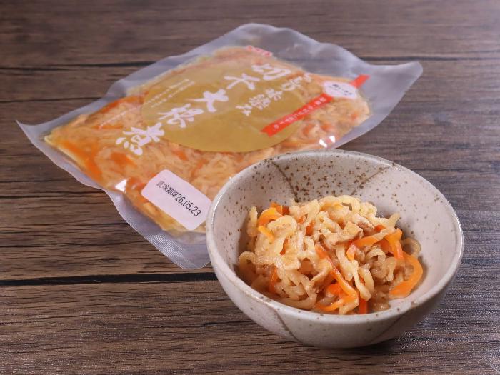 人参(国産)、切干大根(中国産)、砂糖、油あげ、醤油(小麦を含む)、菜種油、昆布エキス、食塩、風味原料(かつお、そうだかつお)、唐辛子/調味料(アミノ酸等)、ビタミンC、凝固剤
