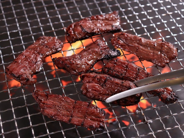 焼肉の人気部位ハラミにやわらか加工をして、食べやすいサイズに手切りでカットしています。