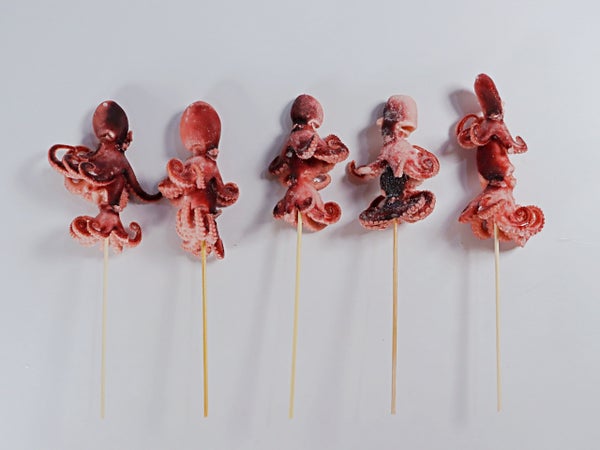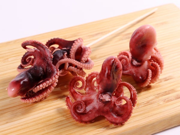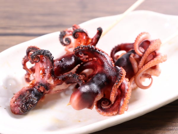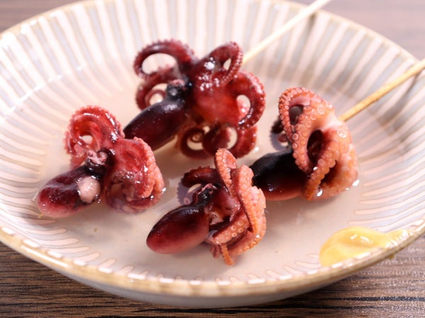 いいだこを2貫串にしました。串焼きはもちろん、煮込んでも固くなりにくいので、おでん種や鍋にもおすすめです。