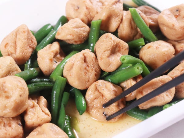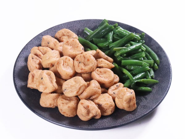 しっかりと味のしみ込んだ、かわいらしい一口サイズのがんもと、いんげんの煮付けです。