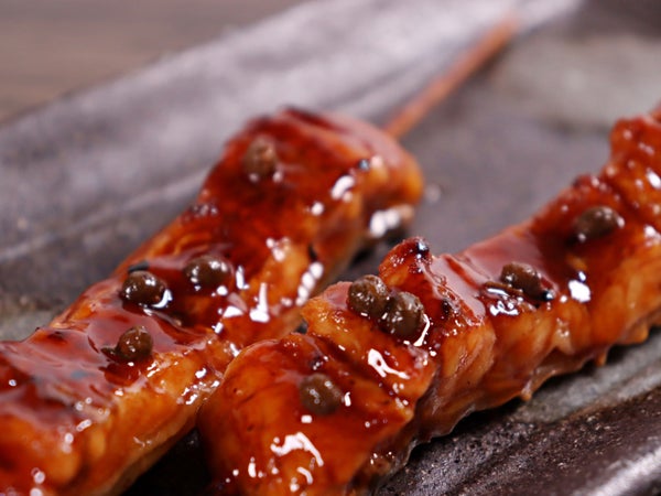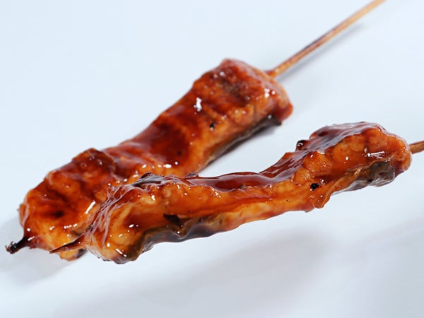 大型のうなぎを使用した蒲焼串です。細く見えますが、厚みがあって脂ののったやわらかくとろけるおいしさを味わえます。どんぶりなどごはんイメージのあるうなぎ蒲焼も串ならおつまみの形になります。
