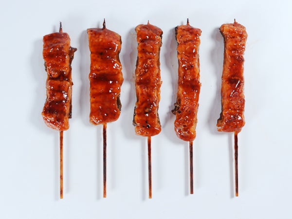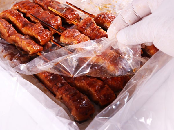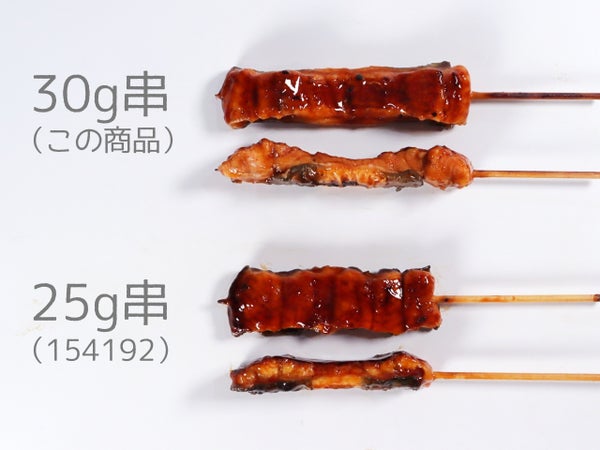 1本約30g。大型うなぎなので、細いですが長く厚い蒲焼串です。